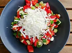 Schopska-Salat (bulgarisch /schopska salata, serbisch-kyrillisch шопска салата/šopska salata, tschechisch Šopský salát[1]) ist ein traditioneller Salat der Balkanküche, der seinen Ursprung in der bulgarischen Küche hat. Der Schopska-Salat wurde unter diesem Namen zum ersten Mal 1956 im Restaurant »Tschernomorez« (bulgarisch Черноморец) im Badeort Druschba, heute Sweti Konstantin am Schwarzen Meer serviert.[2] Das Rezept wurde ursprünglich im 20. Jahrhundert von bulgarischen Köchen aus der Region Shopluk verbreitet und ähnelt dem bekannten serbischen Salat, worin zusätzlich scharfe Paprikas verwendet werden. Ähnliche Zubereitungen waren allerdings schon lange zuvor in Bulgarien, Griechenland, Nordmazedonien und Serbien als Bauernsalat bekannt, jedoch erst in Verbindung mit der Verbreitung der Tomate in der Region ab den 1930er Jahren stehen. Der Schopska-Salat ist Teil der bulgarischen, mazedonischen und serbischen Küche und ebenfalls in südosteuropäischen Ländern wie Kroatien oder Bosnien oder auch in Tschechien weit verbreitet. Der Schopska-Salat ist die Variante eines gemischten Salates auf der Basis von frischem Gemüse, wie er auch in anderen Staaten des Balkans verbreitet ist, so z. B. als Dorfsalat (Choriatiki) in Griechenland, als Hirtensalat (Çoban salatası) in der Türkei sowie in anderen Schwarzmeeranrainern wie Georgien und Russland.