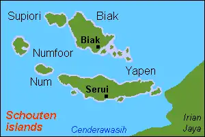 Aufgrund eines Missverständnisses hatte im Jahr 1823 der französische Kartograph Louis Isidore Duperrey einer anderen, rund 800 km südöstlich gelegenen Inselgruppe vor der Ostküste von Papua-Neuguinea ebenfalls den Namen „Schouten“ gegeben;[1] letztere Inselgruppe wurde allerdings später in Le-Maire-Inseln umbenannt.