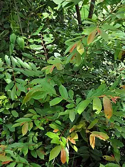 Die einfachen und kurz gestielten Laubblätter sind wechselständig. Der kurze Blattstiel ist bis 1 Zentimeter lang. Die Blätter sind verkehrt-eiförmig bis elliptisch, bespitzt oder spitz bis zugespitzt, seltener stumpf, ganzrandig und im vorderen Teil mehr oder weniger gezähnt. Die ledrigen Spreiten sind bis 17 Zentimeter lang, unterseits fein behaart und oberseits fast kahl. Die Nervatur ist dreizählig. Die kleinen Nebenblätter sind abfallend.