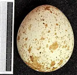Die Eiablage erfolgt in Mitteleuropa selten bereits Ende April, meist jedoch Anfang bis Mitte Mai. Die Gelege bestehen meist aus zwei Eiern, seltener aus nur einem und sehr selten aus drei Eiern. Beispielsweise wurden in Litauen bei 37 Gelegen 8-mal 1 Ei, 28-mal 2 Eier (76 %) und 1-mal 3 Eier gefunden[21], in Ungarn bei 72 Gelegen 20-mal 1 Ei, 51-mal 2 Eier (71 %) und 1-mal 3 Eier.[19] Die Eier sind auf weißem Grund bräunlich oder violett gefleckt. Sie wiegen 72–87 g; vor 1921 im damaligen Deutschland gesammelte Eier maßen im Mittel 62,9 × 50,7 mm.[22]