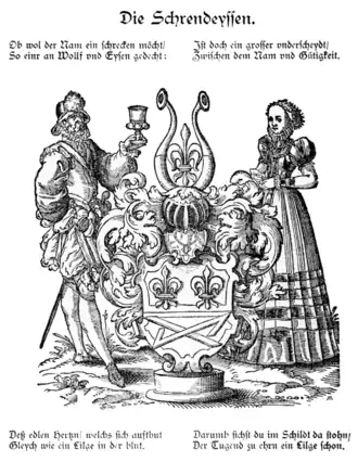Wolf (1534–1598) wurde Ratsherr in Frankfurt am Main und 1592 Mitglied der Gesellschaft bzw. Ganerbschaft Alten Limpurg im Frankfurter Patriziat.[19][20] Er starb ohne männliche Nachkommen. Damit erlosch die Mitgliedschaft der Schrendeisen im Frankfurter Patriziat.
