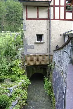 Die Turbine befindet sich in dem Anbau, der über den Mühlgraben reicht.