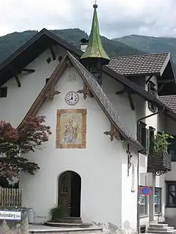- Litzkapelle: Seit mehr als 300 Jahren steht am Beginn des Dorfzentrums von Schruns, an der Abzweigung nach Bartholomäberg, eine anmutige kleine Wallfahrtskapelle. Der Sage nach stand hier früher ein fruchtbarer Birnbaum. Als dieser unerwartet verdorrte, erbaute der Besitzer 1688 an seiner Stelle dieses kleine Kirchlein. Im Mittelpunkt der Kapelle steht heute auf dem Renaissancealtar eine von vielen Menschen verehrte Madonnenstatue.[14] Die Skulpturen des Altares stammen vom Tiroler Bildhauer Melchior Lechleitner. Im Jahre 1981 wurde die Kapelle von Konrad Honold restauriert, wobei sich herausstellte, dass das Deckengemälde „Immaculata“ (lat.: „die Unbefleckte“) aus dem Jahre 1886 vom Schrunser Kunstmaler Jakob Bertle stammt.[15] An der Außenfassade erinnert das in Marmor gehauene Wappen der Grafen von Starhemberg an Ernst Rüdiger Camillo Maria Starhemberg, der 1956 bei dieser Kapelle im 57. Lebensjahr den Herztod erlitt.