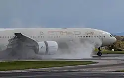 Eine Boeing 777 bremst mit Schubumkehr ab, im Gehäusemantel ist ein Schlitz weit offen. -
