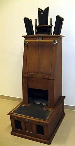 Als gesundheitschädliches Kuriosum gab es um 1950/1960 Durchleuchtungsapparate auf Basis Röntgenstrahlung, sogenannte Pedoskope. Ein hüfthoher hölzerner Kasten mit Auftrittstufe und Öffnung zum Hineinstecken beider Schuhvorderteile stand in manchen Schuhgeschäften. Unter der Stufe wurde durch elektrisches Einschalten eine Röntgenröhre aktiviert, Strahlenabsorption durch Schuh und Knochen und Fluoreszenz in einem Schirm knapp über den Schuhen im abdunkelnden Kasten erzeugte ein Live-Bild mit den bewegten Zehen, das durch typisch 3 ovale Sichtrohre vom Probanden, Schuhverkäufer und Schuheinkaufspartner betrachtet werden konnte – typisch nur wenige Sekunden lang. Vom Adrian X-Ray Shoe Fitter, einem Fluoroskop, hergestellt zumindest ab 1938 in Milwaukee, und anderen wurden etwa 10.000 Exemplare zuerst an Orthopäden, später an Schuhgeschäfte in ganz USA und das US-Militär geliefert, wo sie bis um 1970 verwendet wurden. Die Geräte waren nur gering gegen den Austritt von Röntgenstrahlung abgeschirmt. Ihre Verwendung wurde ab 1950 zunehmend kritisiert, und in mehr und mehr Bundesstaaten der USA reglementiert und schließlich verboten. Im Wesentlichen wurden die Geräte vernichtet, die Oak Ridge Associated Universities besitzen ein Museumsstück.[41][42][43][44] In einem Schuhgeschäft in Wels war nur in einem Schuhgeschäft ein solches (oder ähnliches) Gerät noch nach 1960, doch für wenige Jahre, in sparsamem Gebrauch.