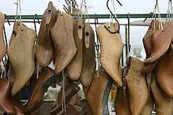 Trotz der günstigeren Fertigungsmöglichkeiten hatten die meisten Menschen um 1900 oft nur zwei Paar Schuhe: eines für den Werktag und eines für den Sonntag. Parallel zu Fabrikschuhen existierte weiterhin der Schuh vom Schuhmacher, der per Handarbeit und nach Maß angefertigt wurde. Die gesellschaftliche Bedeutung des Schuhs wuchs mit dem Kürzerwerden der Röcke der Damen: Schuhe wurden sichtbar und die Frauen zeigten auch gerne Schuh. So entstanden viele verschiedene Formen und Farben; unterschiedliche Materialien kamen zum Einsatz. Frauen trugen meist Schnürstiefeletten und vor allem Knöpfstiefeletten. Für die Knopfstiefel gab es sogar spezielle Knöpfhaken, mit denen das Schließen und Öffnen vereinfacht wurde. Stickereien waren beliebt, sogar die Absätze schmückte man manchmal damit. Auch Rüschen und Perlen zierten die Schuhe.[32]