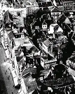 | 10 | Zum goldenen Schloß | Im Jahr 1631 war Andreas Hoffmann Eigentümer. Das Haus gehörte 1651 und auch noch 1681 dem Schuster Johann Hoffmann, 1683 dann bereits seinen Erben. Sein Schwiegersohn, der Schuster Georg Schneider, veräußerte das Haus 1685 für 304 Taler an den Hutmacher Joachim Ferse (auch Verse). Von Ferse erwarb es 1698 für 310 Taler der Schuster Gottfried Wagenführer, der bis 1735 Eigentümer blieb. In der Zeit um 1823 gehörte das Gebäude dem Particulier Gotthilf Heucke. 1942/1943 wurde der Zeitschriftenhändler H. Kaufmann als Eigentümer geführt. Noch in den 1930er Jahren befand sich ein auf Holz gemaltes Gemälde am Haus, das ein Schloss zeigte und den Hausnamen nannte. Über den Verbleib des Bildes ist nichts bekannt.[4] | |