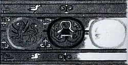 Im breiten Mittelteil der Borte finden sich ovale Medaillons, die Greife und Sirenen zeigen (siehe nebenstehende Zeichnung). Die Borte und die Laschen sind mit doppelten Perlenreihen gerahmt. Die freien Stellen der Schuhe sind mit Motiven aus Reihen aus zwei oder Perlen und je einem Edelstein ausgefüllt. An den beiden Schuhen wurden insgesamt elf Edelsteine verarbeitet: fünf Saphire, vier Amethyste, ein Smaragd und amethystfarbener Glasstein.