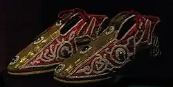 Die Schuhe bestehen aus leuchtend rotem Samit, auf dem eine breite gewebte mit Edelsteinen besetzte Goldborte von der Fußspitze über den Fußrücken bis zur mittleren Lasche verläuft. An der Ferse und an den Seiten sind kleinere Stücke der gleichen Borte angebracht. Am Rand der breiten Borte sind auf den Längsseiten schmale Randstreifen angebracht, auf denen stilisierte Lebensbäume mit Vögeln dargestellt werden.