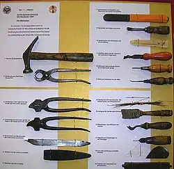 Hammer (für Klopfarbeiten), Beißzange (zum Rausziehen der Zwicknägel), breite Zwickzange (zum Ziehen des Schafts über den Leisten), schmale Zwickzange oder Faltenzange (für das Verteilen der Oberlederfalten an Spitze und Ferse), Kneipmesser (zum Beschneiden der Sohlen und Absätze), Wetzstein (zum Schärfen des Kneip), Wetzstahl (zum Nachschärfen), Raspel (hier zusätzlich mit Sandpapier umwickelt, für das Bearbeiten der Sohlen und Absätze), Täcksheber (zum Rausziehen der Nägel), Spitzknochen (für das Beidrücken und Schnittöffnen), Rissöffner (zum Freimachen des Schnitts in der Sohle), Risskratzer (für das Tieferlegen des Schnitts), Querahle (zum Vorstechen der Bodennahtlöcher), Stahl- und Schweinsborsten (als Nähnadeln), Aufrauer (für die Vorbereitung der Klebflächen), Randmesser (für das Ablassen/Entgraten der Sohlenkanten), Rundahle/Nagelort (zum Vorstechen der Löcher für die Holznägel), Glasscherbe bzw. Ziehklinge (für das Entfernen des Ledernarbens), Putzholz (zum Andrücken der Sohlenkanten).[5]