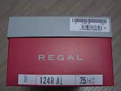 Stirnseite einer Schuhschachtel (Stülpdeckelschachtel) mit Barcode-Etikett und Handels-Angaben.