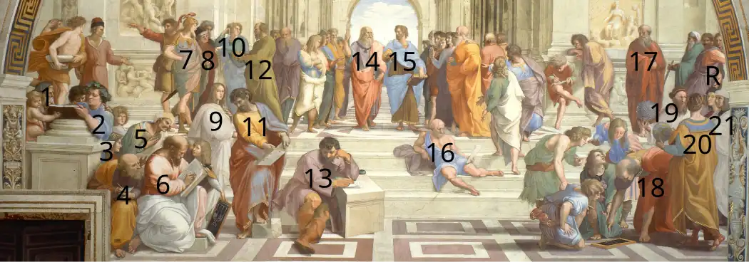 Es gibt keine einheitliche Lehrmeinung über die Zuordnung der abgebildeten Figuren. Je nach Autor weichen die Interpretationen voneinander ab oder geben mehrere mögliche Personen für die gleiche Figur an. Unstrittig sind die zentralen Figuren (Nr. 14 und 15) als miteinander im Disput befindliche Platon und Aristoteles. Nach Darstellung des Kunsthistorikers Luitpold Dussler von 1966 gelten weiterhin lediglich die Darstellungen von Sokrates (gemäß Nummerierung unten 12), Pythagoras (6), Euklid (18), Ptolemäus (20), Zarathustra (19), Raffael (R), Sodoma und Diogenes (16) als gesichert. Weitere Zuweisungen seien lediglich spekulativer Natur.[2] Neuere Forschung versucht sowohl zusätzliche, als auch davon abweichende Zuordnungen.[3]