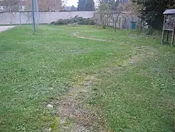 Lage des neuen Schulgartens zwischen der Ortrander Straße 5 und 6 Die Anlage besteht aus einem Kräuterbeet mit Kräuterspirale, das durch einen gewundenen Weg mit einem Heidegarten und Grillplatz / Sitzecke verbunden war. Eine Garagenwand im Westen wird durch eine Beerenhecke abgeschirmt. Mit angelegt wurde ein Volleyballplatz.