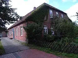 Das eingeschossige traufständige verklinkerte Gebäude mit pfannengedecktem Krüppelwalmdach, breitem West- und Ostgiebel, Eingängen an der Traufseite und am Ostgiebel, wurde 1851 als zweiklassige Schule sowie als Wohnung für den Organisten und Lehrer gebaut. Es wurde zeitweise vom Organisten und vom Pastor oder als Gemeindehaus genutzt.[1]