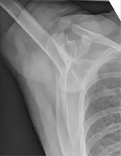 Das Schultergelenk ist federnd fixiert, es besteht ein Spontan- und Bewegungsschmerz. Der Arm steht bei der vorderen Luxation meist in Abduktion und Außenrotation und wird mit dem gesunden Arm gehalten.[1] Die Schulterkontur ist eher eckig, da der Musculus deltoideus bei nach kaudal verschobenem Oberarm straff über das Acromion gespannt wird. Die Gelenkpfanne ist leer und der Humeruskopf in den Weichteilen zumeist unterhalb der äußeren Clavicula tastbar. Bei der Schädigung von axillären Gefäßen oder Nerven kommt es zu Störungen der Durchblutung, Motorik und Sensibilität im Arm.