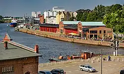 Schuppen 10 (rechts) mit Burgtor (links), Hubbrücke über den Elbe-Lübeck-Kanal und Turm der Jakobikirche -