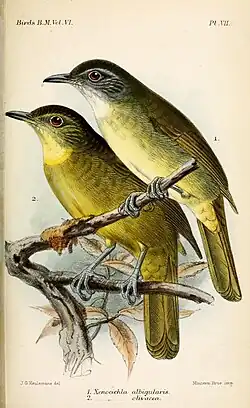 Schuppenkopfbülbül (oben) und Gelbfleckbülbül (unten), John Gerrard Keulemans – Catalogue of the birds in the British Museum. Volume 6 | ||||||||||||