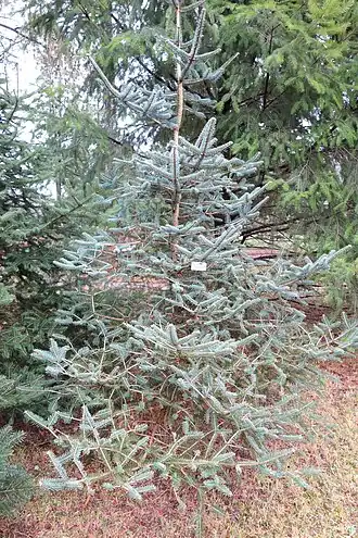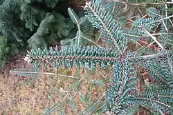 Die kugeligen Winterknospen sind harzig. Die geraden oder leicht gebogenen, spitzen oder stumpfen Nadeln werden 1,5 bis 3 Zentimeter lang und rund 2 Millimeter breit. Die Nadeloberseite ist dunkelgrün gefärbt. An der Nadelunterseite findet man zwei weiße Stomatabänder. Die Nadeln stehen in zwei Reihen dicht gedrängt an den Zweigen.[1]