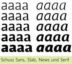 Die vier Stile der Schuss sind im Duktus sehr ähnlich. Auf das Wesentliche reduziert, eignen sie sich für Fließtext und sind somit auch als Verkehrsschrift für größere Distanzen konzipiert. Eine Universalschrift, zurückhaltend im Design. Jede Familie, also jeder Stil, besteht aus fünf Strichstärken, verschiedenen Ziffernarten und Kapitälchen. Der Zeichenausbau der Pro-Schnitte ist Latin extended, während die fünf Schnitte der Sans zusätzlich auch Griechisch und Kyrillisch beinhalten. Die Tabellen-Ziffern und die dazugehörigen mathematischen Zeichen haben über alle Stile und Gewichte hinweg eine identische Breite. Mit derzeit 40 Pro-Fonts (insgesamt 28400 Zeichen) gehört sie zu den großen Schriftsippen.