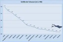 Auf ihrer Länge von rund 59 Kilometern verliert die Schussen 182 Meter an Höhe; das entspricht einem durchschnittlichen Gefälle von 3,1 ‰. Die stärksten Gefällabschnitte durchfließt sie südlich von Bad Schussenried mit maximal 7,8 ‰ und im Schussentobel. Hier durchbricht die Schussen die Moränenwälle des Singener Stadiums und fällt auf einer Länge von rund neun Kilometern um etwa 85 Meter (= 8 ‰). In Kehlen-Gerbertshaus (401,58 m ü. NN) liegt die Schussen noch sechs Meter über dem Niveau des Bodensees, zuletzt sinkt das Gefälle also auf 0,07 ‰.[3]