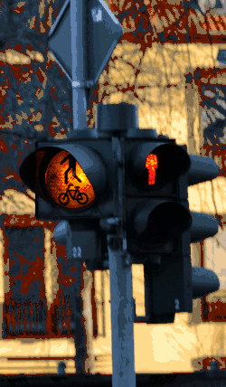 Schutzblinker mit Fußgänger- oder Fahrradsymbol warnen den Kraftverkehr vor diesem querenden unmotorisierten Verkehr.
