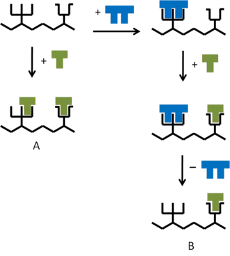 Typische Synthese unter Verwendung einer Schutzgruppe (blau). Die Schutzgruppe ist weder im Edukt (oben links) noch im Zielmolekül B enthalten. Sie wird nur vorübergehend benötigt, um ein anderes reaktives Zentrum im Molekül während der Umsetzung mit einem Reagenz (grün) zu schützen. Bei Abwesenheit der Schutzgruppe wird das Ausgangsmolekül an beiden reaktiven Zentren angegriffen und das unerwünschte Produkt A erhalten.