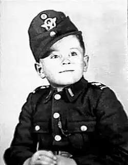 Erst ab Juni 1942 erfolgte eine annähernd systematische Einkleidung der Schuma, mit ausrangierten schwarzen Uniformen der Allgemeinen SS. Davon wurden alle Abzeichen entfernt und stattdessen bunte Kragen, Taschenklappen und Ärmelaufschläge, in der Farbe des Dienstzweiges, angebracht: in Grün (Schutzpolizei), Orange (Gendarmerie) oder Rot (Feuerschutzmannschaften).[2] Ukrainische Einheiten trugen häufig alternativ Hellblau als Abzeichenfarbe.[3] In manchen Einheiten fehlten die farbigen Applikationen indes völlig oder teilweise.