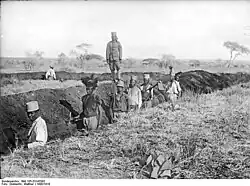 Neben den Soldaten und Hilfstruppen kamen in großer Zahl Träger zum Einsatz. Ihre Zahl überstieg die der Soldaten um ein Mehrfaches. Auf dem Höhepunkt ihrer Mannschaftsstärke im Jahr 1916 hatte die Schutztruppe ca. 45.000 Träger.[21] Als die Schutztruppe 1918 kapitulierte, waren 3000 Träger bei den letzten 155 Europäern und 1168 Askaris. Während sie anfangs angeworben worden waren, wurden sie im weiteren Verlauf des Krieges in diesen Dienst gepresst. Insbesondere wurde seit dem Übertritt der Schutztruppe auf portugiesisches Gebiet im November 1917 zwischen den aus Deutsch-Ostafrika mitgebrachten Trägern, die formal freiwillig eingetreten waren und für ihren Dienst bezahlt wurden, und unbezahlten sogenannten „Landschaftsträgern“ unterschieden, bei denen es sich um aus mosambikanischen Dörfern verschleppte Sklaven sowie gefangen genommene portugiesische Askaris handelte, die mit Telefondrähten aneinander gefesselt waren.[22] Insgesamt dürften auf deutscher Seite an die 200.000 Träger während der Kriegsjahre eingesetzt worden sein. Ihre Verlustraten waren durch harte Einsatzbedingungen, schlechte Ernährung und mangelnde medizinische Versorgung sehr hoch.[23]