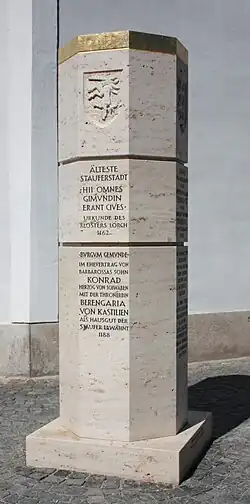 Eine prägende Periode für Gmünd war die Zeit der Staufer im 12. und 13. Jahrhundert. Die erste überlieferte Erwähnung von Gmünd als Stadt ist auf das Jahr 1162 datiert – früher als bei jeder anderen Stadt der Staufer –, weshalb sich Gmünd als „älteste Stauferstadt“ bezeichnet.[13] In einer Urkunde des Klosters Lorch wurden Gmünder Bürger 1162 erstmals als cives (Bewohner einer Stadt) erwähnt.[14] In einer Urkunde von Friedrich Barbarossa wird die Stadt als burgum Gemunde erwähnt. Der Begriff burgum wurde im Hochmittelalter für Burgen und befestigte Städte verwendet. Gmünd muss demnach 1188 bereits eine befestigte Stadt mit Mauer und Türmen gewesen sein, was aus der Urkunde von 1162 noch nicht abzulesen ist.[14] Im Reichssteuerverzeichnis von 1241 nimmt Gmünd mit einem Steueraufkommen von 152 Mark Silber unter 92 Orten im Reich den Platz 10 ein.[14] An die Zeit der Staufer erinnert heute die Stauferstele auf dem Johannisplatz, die 2012 im Zuge des mit Bezug auf die Urkunde von 1162 gefeierten 850-jährigen Stadtjubiläums eingeweiht wurde.[15]