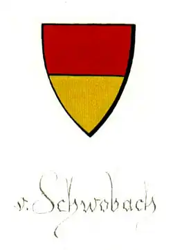 Die Familie von Schwabach gen. Schwabecher, benannt nach dem Dorf Schwabach (heute: Schwobacher Hof,[1] Gemeinde Waldsolms, Lahn-Dill-Kreis, Hessen), ist ihrem Ursprung nach ein wetterau-nassauisches Adelsgeschlecht mit dem gleichnamigen Stammhaus im östlichen Hintertaunus in Hessen.