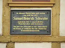 Das in der Johannisstraße 18 in der Neustadt von Dessau gelegene Schwabehaus wurde von dem Zimmermann Wilhelm Corte 1826 erbaut. Hier lebte ab 1830 der Astronom Samuel Heinrich Schwabe, der 1843 die elfjährige Periodizität der Sonnenflecken entdeckte.[1]