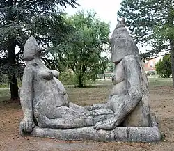 - Zwei Skulpturen stellen Schwaben im öffentlichen Raum Berlins dar: Die 1978 errichtete Skulptur Die Sieben Schwaben von Hans-Georg Damm auf einer Straßeninsel am Fehrbelliner Platz und die Skulptur Schwäbische Floßfahrer von Peter Lenk.[48] Lenk wollte sie in den 1980er Jahren auf dem Kurfürstendamm aufstellen, was jedoch nicht zustande kam.[49] Sie steht heute in der Walterhöferstraße in Berlin-Zehlendorf. Nachdem der Bezirk Wilmersdorf Damms Skulptur zunächst nicht ankaufte, bekundete Daimler in Stuttgart Interesse. Der in Stuttgart geborene Verleger Franz Karl Maier, Herausgeber des Tagesspiegels, spendete dem Bezirksamt 50.000 DM, sodass die Skulptur 1991 angekauft werden konnte.[50]
