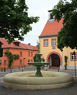 Rund um Marktplatz mit seinem alten Marktbrunnen befinden sich herrschaftliche Anwesen aus dem 18. Jahrhundert. Dort befinden sich das barocke Rathaus von 1742 mit einer Laubenhalle sowie die Evangelische Kirche aus dem Jahr 1844 mit ihrem minarettartigen Turm. Das Innere der Kirche wurde 1911 mit einer Jugendstilausmalung versehen.