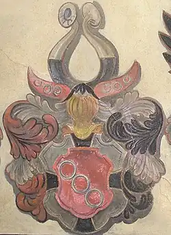 In rot drei silberne, schrägrechts übereinander gelegte Ringe. Als Helmzier zwei schwarz-silberne Büffelhörner über zwei roten Büffelohren mit drei silbernen Ringen. Helmdecke in rot und silber.
