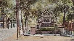 1900 wurde ein Brunnen angelegt. Der Bochumer Steinmetzmeister Josef Schmidt[4] schuf ihn aus Granit und rotem Marmor. Er war mit Tierskulpturen versehen (Schnecke, Wasserratte und zwei Delphine). Aus einem Löwenkopf entsprang Wasser. Im Volksmund wurde der Brunnen „Löwenbrunnen“ genannt. Ältere Karten zeigen ihn von der Vorderansicht mit der Rheinischen Straße in Richtung des Bahnhofs der Rheinischen Eisenbahn-Gesellschaft. Um 1914/15 wurde er auf die Seite mit dem Bahndamm versetzt. In den 1950er Jahren wurde er beseitigt.[5]