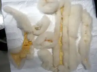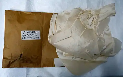 - ↑ Foto Material lining swanscoat (Umschlag mit Futterresten); Foto Fellreste.