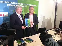 Nach den ersten Sondierungsgesprächen wurden Alternativen zu einer Fortsetzung von Schwarz-Grün jeweils mindestens von einem potenziellen Koalitionspartner abgelehnt. Daher beschlossen die Landesvorstände von CDU und Grünen unmittelbar nach der Verkündung des endgültigen Wahlergebnisses jeweils einstimmig die Aufnahme von Koalitionsverhandlungen über eine Verlängerung der Zusammenarbeit für weitere fünf Jahre.[17][18] Nach erfolgreichen Verhandlungen wurde der zweite Koalitionsvertrag von Schwarz-Grün in Hessen im Dezember 2018 unterzeichnet. Am 18. Januar 2019 wurde das Kabinett Bouffier III vereidigt.
