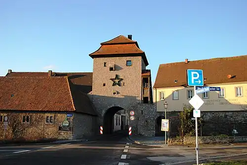 Nachdem Sommerach im 15. Jahrhundert immer wieder kriegerischen Eroberungen ausgesetzt war, begannen die Äbte von Münsterschwarzach, die damals die Dorfherrschaft hatten, um das Dorf eine Ringmauer mit vier Toren anzulegen. Im Südosten des Dorfes befand sich das mächtigste Tor der Befestigung, weil dort der Weg nach Schwarzach zum Kloster der Grundherren verlief.
