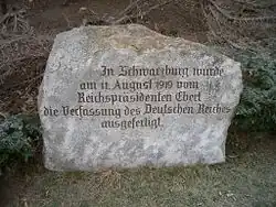 Besondere historische Bedeutung erlangte Schwarzburg, als Reichspräsident Friedrich Ebert im Urlaub am 11. August 1919 die Weimarer Verfassung unterzeichnete. Dieser Akt fand im Zimmer 7 der damals zum Hotel „Weißer Hirsch“ gehörigen Villa „Schwarzaburg“ (heute: „Hotel SchwarzaBurg“) statt, in der Ebert wohnte, nachdem er vom Hauptgebäude des Hotels dorthin umgezogen war.[4][5] Im Park zwischen den beiden Gebäuden befindet sich ein Gedenkfels mit der Inschrift: