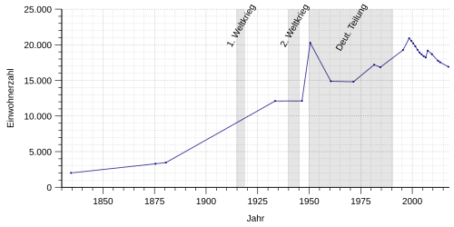 Die Einwohnerzahl wuchs im Verlauf des 19. Jahrhunderts kontinuierlich. Durch neue Fabriken, sinkende Kindersterblichkeit und Eingemeindungen begünstigt verdreifachte sie sich nahezu zwischen 1875 und 1933 auf über 12.000. Die Lücke nach dem Zweiten Weltkrieg wurde schnell durch zugezogene Flüchtlinge und Arbeiter geschlossen, sodass bis 1950 über 20.000 Menschen in der Stadt lebten. Mit dem Rückgang der Bergbautätigkeit der SDAG Wismut sank die Bevölkerungszahl innerhalb von zehn Jahren um etwa ein Viertel, blieb, unter anderem durch den Pillenknick, weitere zehn Jahre etwa konstant und stieg bis zum Ende der DDR wieder an. Der Bevölkerungsschwund durch Arbeitslosigkeit, Fortzug junger Familien und die geringe Geburtenrate zeigte sich durch die Eingemeindungen umliegender Dörfer nur undeutlich. Mit den Einwohnern der 1999 und 2008 eingemeindeten Orte (siehe oben) sank die Bevölkerung um mehr als 2500 und liegt heute bei rund 15.000 Einwohnern.[24]