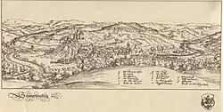 Anhand der ältesten erhaltenen Abbildung der Stadt, einer Federzeichnung Wilhelm Dilichs von 1627, lässt sich das ursprüngliche Stadtbild erahnen. Am Ende der Oberen Schloßstraße steht an exponierter Stelle das kurfürstliche Jagdschloss, das seine heutige Gestalt 1852 erhielt. Am anderen Ende der Straße ist der Dachreiter des Rathauses auf der Ostseite des Marktes zu erkennen. Das dritte auffällige Gebäude im historischen Stadtkern war die Kirche, die im 17. Jahrhundert zu klein und durch die St.-Georgen-Kirche ersetzt wurde. Neben der alten Kirche befand sich der Friedhof an der Stelle, die heute als Unterer Markt bezeichnet wird. Bald wurde auch der Gottesacker zu klein und durch einen zweiten, außerhalb der Stadtmauern, entlastet und später ganz ersetzt. Von den Stadtmauern selbst ist bereits auf Dilichs Zeichnung nichts mehr zu sehen. Bis heute haben sich lediglich die Bezeichnungen Oberes Tor und Unteres Tor erhalten. Als die Gebäude innerhalb der Stadt für die stetig wachsende Bevölkerung nicht mehr ausreichten, errichtete man Häuser auch außerhalb der Stadtmauer. Auf der oben genannten Zeichnung lassen sich unterhalb der Kirche die Gebäude der Vorstadt erkennen.