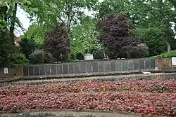 Am 20. August 1956 beschloss der Rat der Stadt Nordhorn die Neugestaltung des Kriegerdenkmals am Langemarckplatz[24] und beauftragte Stadtbaurat Alfred Dietrich mit der Durchführung. Dietrich engagierte den Garten- und Landschaftsarchitekten Wilhelm Hübotter, der die Stadt bereits 1929 hinsichtlich der gärtnerischen Anlage beraten hatte und nun mit der Planung des Nordhorner Südfriedhofs beschäftigt war, als Berater. Im August 1958 genehmigte der Stadtrat die Absenkung des gesamten keilförmigen Areals sowie die Anlage einer den Denkmalbereich an der schmalsten Seite des Grundstücksdreiecks einrahmenden Backsteinmauer, die die Funktion einer Gedenkmauer haben sollte.[25]