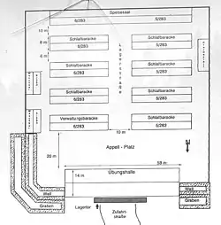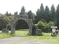 Das ehemalige Reichsarbeitsdienstlager Hochrhön, auch als Dr.-Hellmuth-Lager bezeichnet, lag am östlichen Rand des Schwarzen Moores. Das 1936 errichtete steinerne Tor im Eingangsbereich erinnert heute als Mahnmal daran. Das Lager wurde zwischen August 1934 und Frühjahr 1936 errichtet und beherbergte etwa 300 Personen. Mainfrankens Gauleiter Otto Hellmuth wollte mit seinem „Rhönaufbauplan“ die wirtschaftlich schwache Region kultivieren und für die Landwirtschaft öffnen (der sogenannte Dr.-Hellmuth-Plan zur Neuordnung des Gaues Mainfranken). Die Rhön war als Notstandsgebiet, aus dem ein Wohlstandsgebiet werden sollte, definiert. Aufgaben des Reichsarbeitsdienstes (RAD) waren: Drainagen legen, Entfernung von Steinen, Fichtenanpflanzungen und Kartoffelanbau. Die Maßnahmen brachten nicht das gewünschte Ergebnis. 1945 wurde das Lager aufgegeben und bis auf die Fundamente, die noch zu erkennen sind, abgetragen. Von den RAD-Männern wurde bis 1938 der Rhönhof (Ludwig-Siebert-Hof) als Musterhof fertiggestellt.[24] Während dieser Zeit wurden etwa 500 Hektar Jungwald aufgeforstet. Die Aufforstungen um das Schwarze Moor rühren von diesen Maßnahmen her.[25][26]
