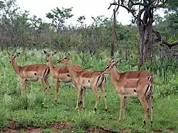 - ↑ Torsten Wronsky: Feeding ecology and foraging behaviour of impala Aepyceros melampus in Lake Mburo National Park, Uganda. African Journal of Ecology 40, 2002, S. 205–211