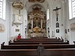 Die äußere Schlichtheit des Bauwerks steht im Gegensatz zum reich ausgestatteten Innern, das jedoch wegen der weiß-goldenen Farbgebung trotzdem eher zurückhaltend, gar höfisch wirkt. Hier fällt vor allem der Altar mit dem Mariahilf-Bildnis von Joseph Götsch aus dem Jahr 1767 ins Auge, der auch eine figürliche Darstellung des zweiten Namenspatrons Johann Nepomuk birgt. Auch die erst 1811 hinzugekommenen Fresken des Künstlers Sebastian Rechenhauer, der aus einem Dorf nahe der Kirche stammt, sind sehenswert.