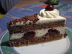 1934 wurde ein Rezept der Schwarzwälder Kirschtorte erstmals veröffentlicht.[3] Das Rezept sah keinen Schokoladenboden, sondern einen Haselnussmürbeteigboden vor, auf den Kirschkonfitüre gestrichen wurde, bevor ein mit Kirschwasser und Zucker beträufelter Boden aus Walnussmasse folgte. Darauf verteilte man zwei Ringe Buttercreme und einen Berg Kirschcremesahne (Eier, Zucker, Milch, Gelatine, Sahne, Mandeln, geschmorte Sauerkirschen). Bedeckt wurde alles schließlich mit einer weiteren Schicht Walnussmasse-Boden. Die gewölbte Oberfläche bestand, wie heute auch, aus Sahne mit Schokoladenspänen, bestäubt mit Puderzucker.