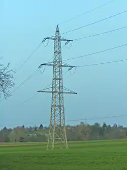 Mast der 380-kV-Leitung Engstlatt-Laufenburg südlich des Umspannwerks Engstlatt mit den blind endenden 220-kV-Stromkreis der einstigen Schwarzwaldleitung südlich des Umspannwerks Engstlatt
