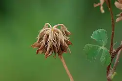 Die Laubblätter sind, mit Ausnahme der allerobersten, lang gestielt. Die Blattspreiten sind dreifiedrig. Die Fiederblättchen bei einer Länge von 0,5 bis 4 Zentimetern sowie einer Breite vom 0,3 bis 2,5 Zentimetern eiförmig bis fast dreieckig mit stumpfem oder gekerbtem oberen Ende und zur Basis hin schmaler werdend. Der Blattrand ist fein gezähnelt. Die papierartigen Nebenblätter sind bei einer Länge von 4 und 20 Millimetern dreieckig bis lanzettlich und der obere freie Teil endet in einer abrupten Spitze.