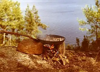 Ein See in Dalsland, Schweden: Pilze brutzeln in der Pfanne der Fahrtengruppe.
