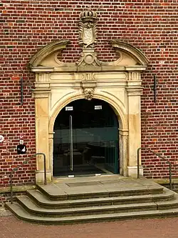 An der westlichen Schauseite des Gebäudes, der Schmalseite zum Fischmarkt, liegt das Hauptportal aus Sandstein mit Segmentbogen. Darüber befindet sich ein Relief mit Kartusche, das mit C XII, dem Monogramm des schwedischen Königs Karl XII., versehen ist. Über der Kartusche ist eine Königskrone dargestellt. Ein weiteres Sandsteinportal liegt an der Nordseite, es wird aber seit den Umbauarbeiten im Jahr 2012 teilweise durch einen Außenaufzug verdeckt. In der Mitte von Nord- und Ostseite des Daches liegen große Aufzugserker.